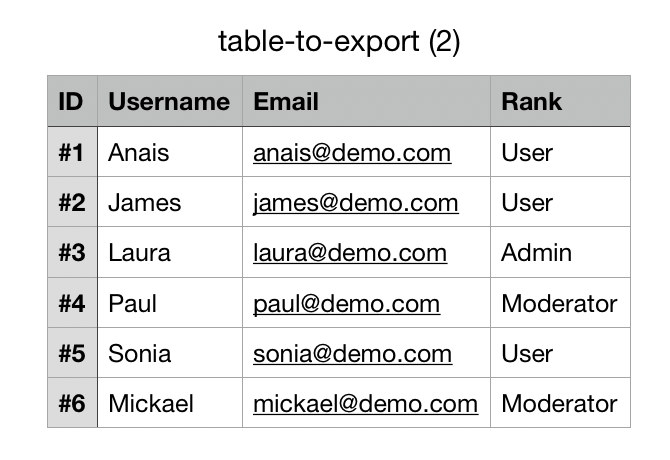 </html>Now, create an HTML table that we will later export using our Javascript plugin. Make sure to add an ID to your table (in my case “table-to-export”) that we will later use in our jQuery code.