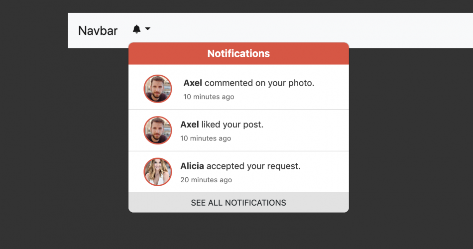 To achieve that result, I have simply based my code on the default Bootstrap 4 dropdown component in a navbar. Mostly the CSS but also the HTML have been updated to make a beautiful and easy to integrate notifications component.