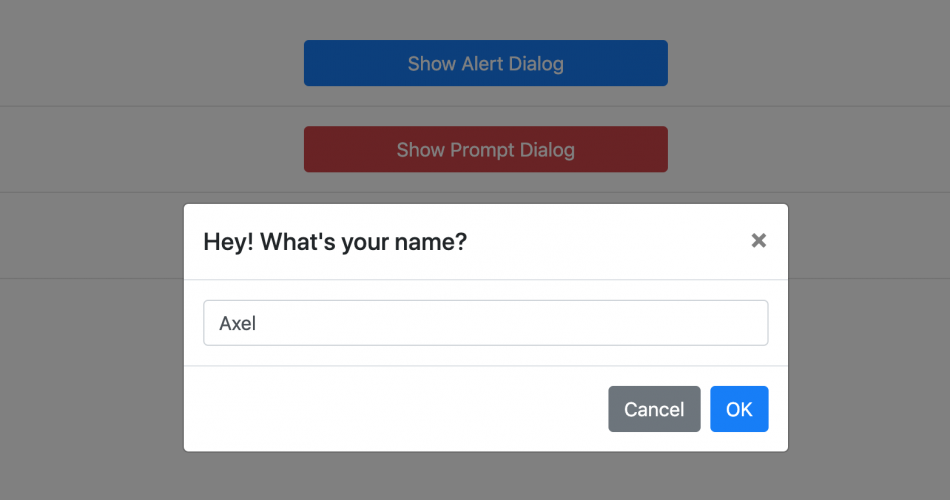 Still a bit more complicated than the previous ones but easy to understand. Actually, a confirm dialog gives two options to the user with some buttons. For example, I often use it on a “delete” action to ask for a confirmation when a user is about to delete some data (Are you sure you want to delete X? Yes / No).
