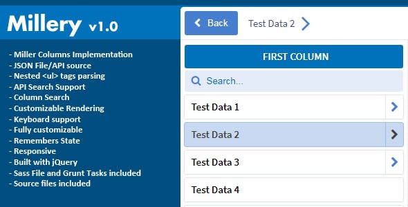 Millery is a multi-purpose Miller Columns plugin, built using jQuery library. Supports HTML Lists, JSON static files, JSON API results, and will support more. Uses SCSS files for templating. Grunt for automation.