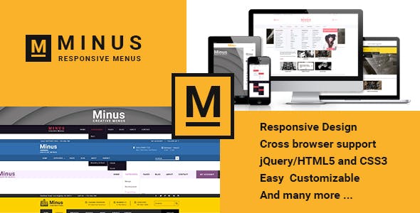 Minus Navigation Menus is a fun, colorful, fully responsive Menus. We utilize HTML 5, css3 to bring you 14 unique designs features that are sure to fit any website design. Our clean code and clear documentation should answer any questions you might have. However, if you still need a little help, we offer 6 months support at no extra cost, and a full year for a nominal fee.Minus navigation menu plugin based on Modern UI and Clean look in recent trend. It’s very lightweight and looks good on almost all major browsers and devices. It contains a different kind of design for different sectors like E-commerce, Construction, Corporate, Creative portfolio etc. It supports responsive design and works well on touch devices.It’s very Easy to customize and change colors. Well documented and clear instructions so you can use it yourself.