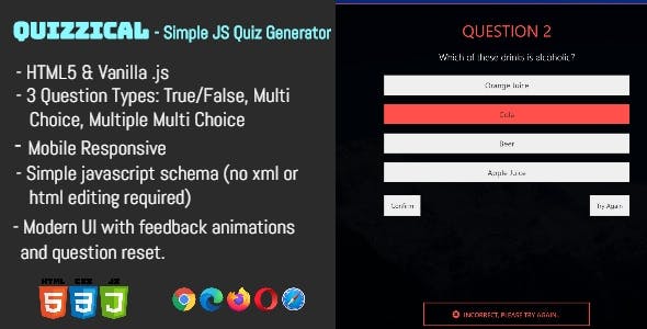 Quizzical is a lightweight javascript quiz generator plugin. Use quizzical to easily create true/false, multiple choice and multiple multi choice quiz questions in html.