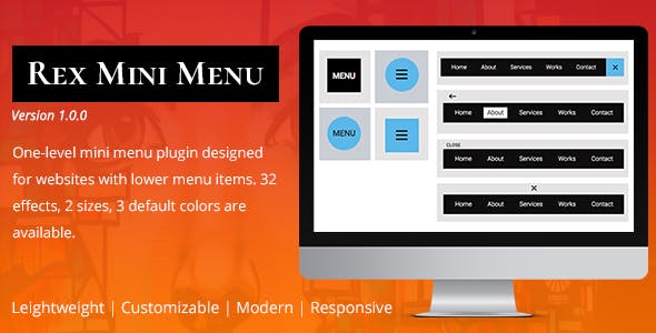 Rex Mini Menu is a small, one-level menu plugin intended to be used for websites with few menu items and where space is limited. There are 32 different effects, normal and large sizes and default, black and white colors.