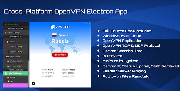 The app consists of a number of JavaScript, JSON, HTML and CSS files that enable a link between OpenVPN and any Desktop OS or Server. The default usage is to compile it as a VPN Application or use the files on a Client-Server. Depending on how you use the Code, you can compile an OpenVPN application for Windows, macOS, Linux or you can use the JS files to build your own Front-end. If you compile the app on all previously mentioned Operating Systems then you will have a VPN application for each OS. The Electron.js API will ensure full Cross-Platform compatibility.