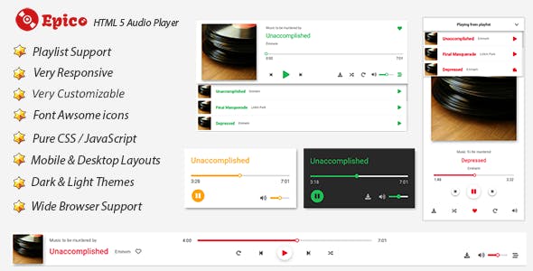 Epico is a responsive customizable HTML 5 Audio Player that supports multiple layouts (desktop & mobile) made with pure JavaScript & CSS and supported by almost any browser, the player support playlist mode and you can customize almost everything you like from icons, colors and more.