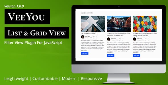 VeeYou list and grid view filters plugin is a tiny JavaScript plugin that add list view and grid view options to you lists of contents. This plugin enables users to select the way they want to see your list of contents. It’s useful for list of information like posts items, portfolio items, work samples, e-commerce items or any other contents. The plugin is pretty configurable, you can set image sizes, grid colomns or hide certain elements in grid view.