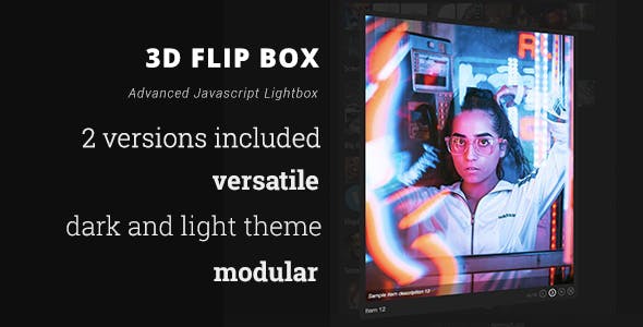 3D Flip Box is an advanced lightbox javascript application that takes the traditional lightbox user experience to the next level. The transitional effect is a creative implementation with each items being put on the opposite sides of a flipping plane where users can swipe left and right to trigger the transition . The Lightbox can display a variety of content including photos, inline html, embedded media from vimeo, youtube, google maps or AJAX content.