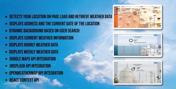 This is a weather application developed in react js. It provides current weather information along with weekly and hourly data. It uses the following APIs: