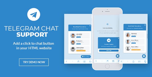 This jQuery Telegram plugin displays a list of Telegram usernames on your site which when clicked, will take your customer to https://telegram.me/ if he is on desktop (which will open the Telegram program), or will open the Telegram application if he is on mobile. Your customer must have the Telegram app installed on his computer or his phone in order to chat with your support team.